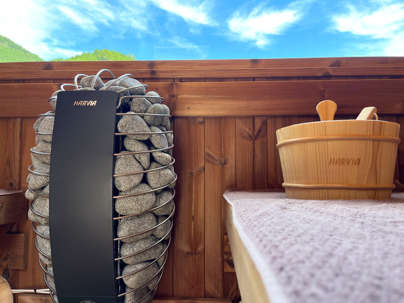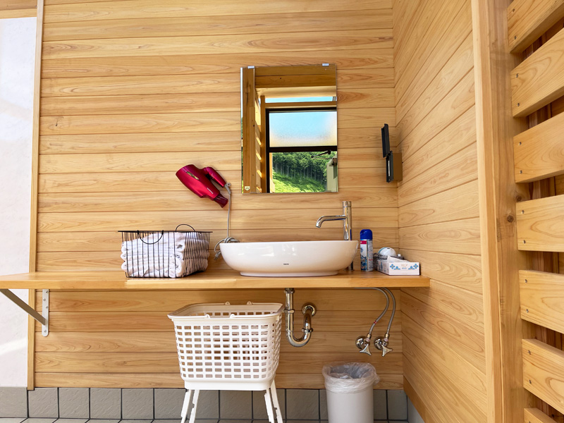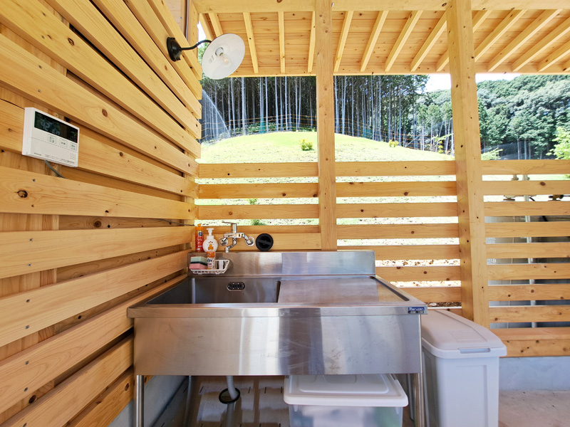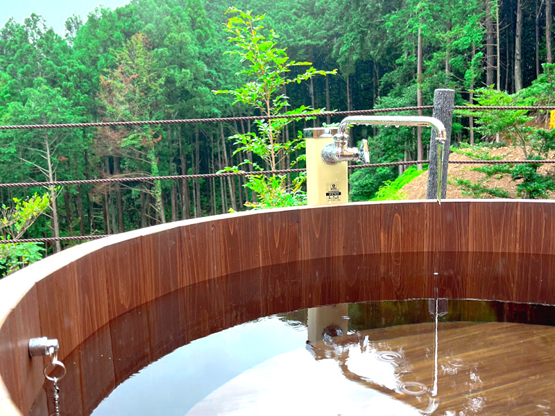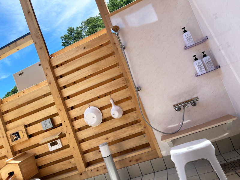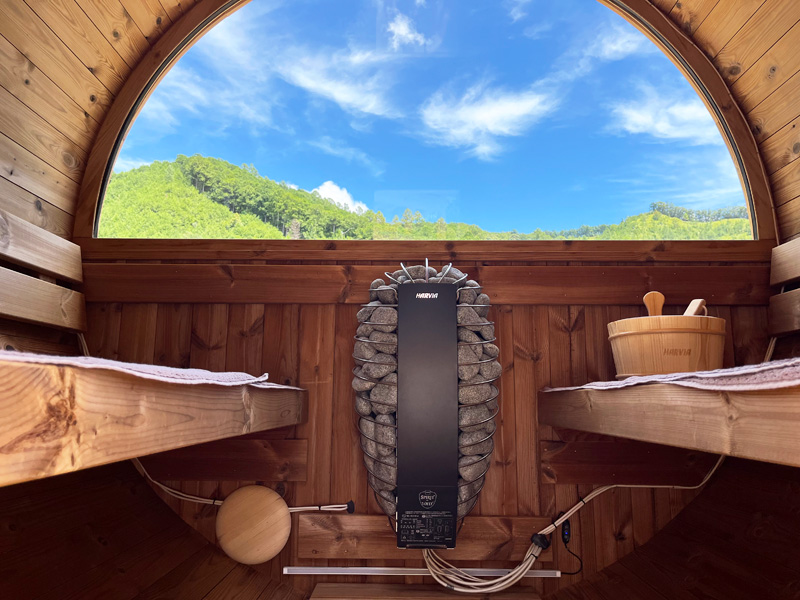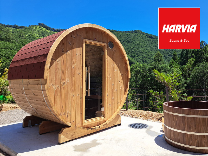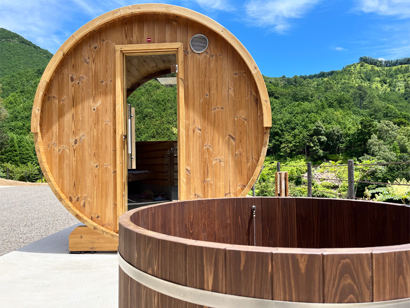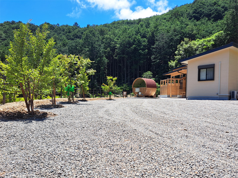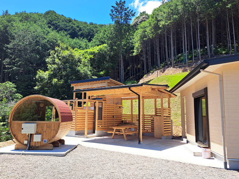露天風呂、シャワー、バレルサウナ、水風呂、BBQテラス、ミニコテージ、炊事場、トイレ、AC電源付き
