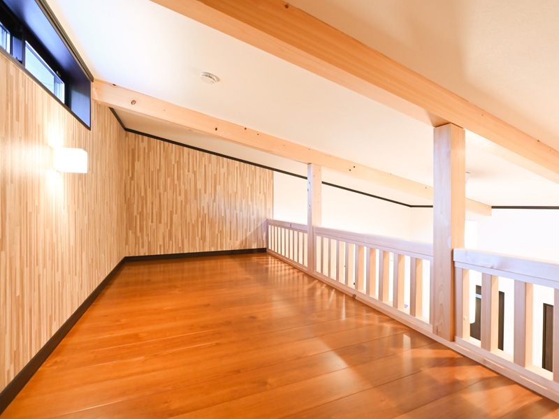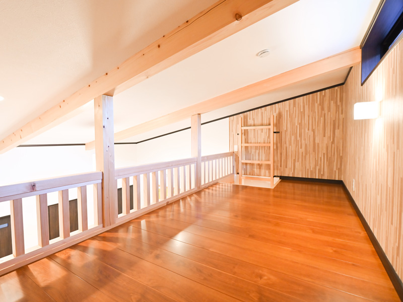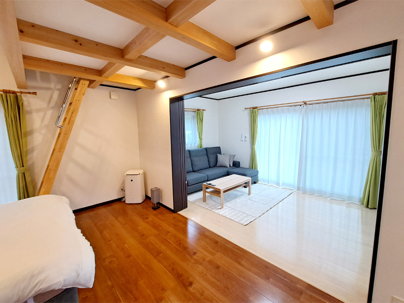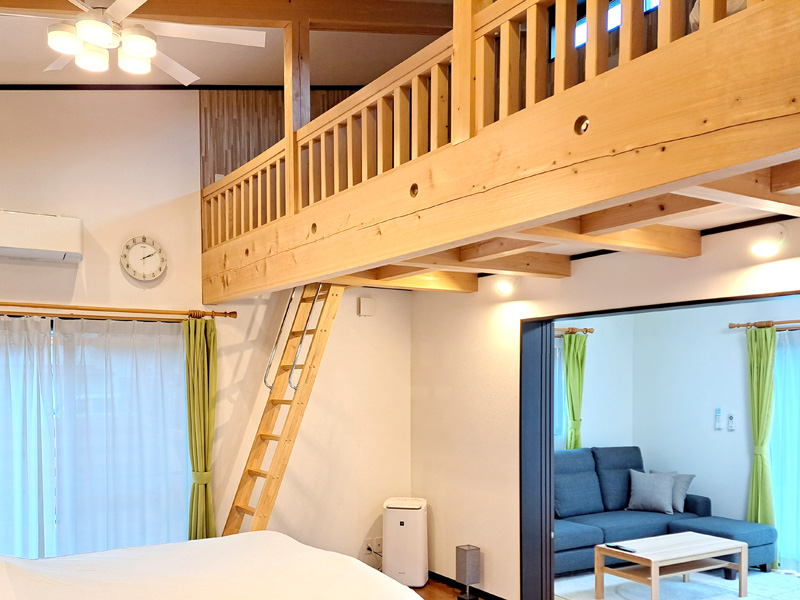 フローリング16畳、フローリング8畳、ロフト4畳、ウッドデッキ、クイーンサイズベッド
